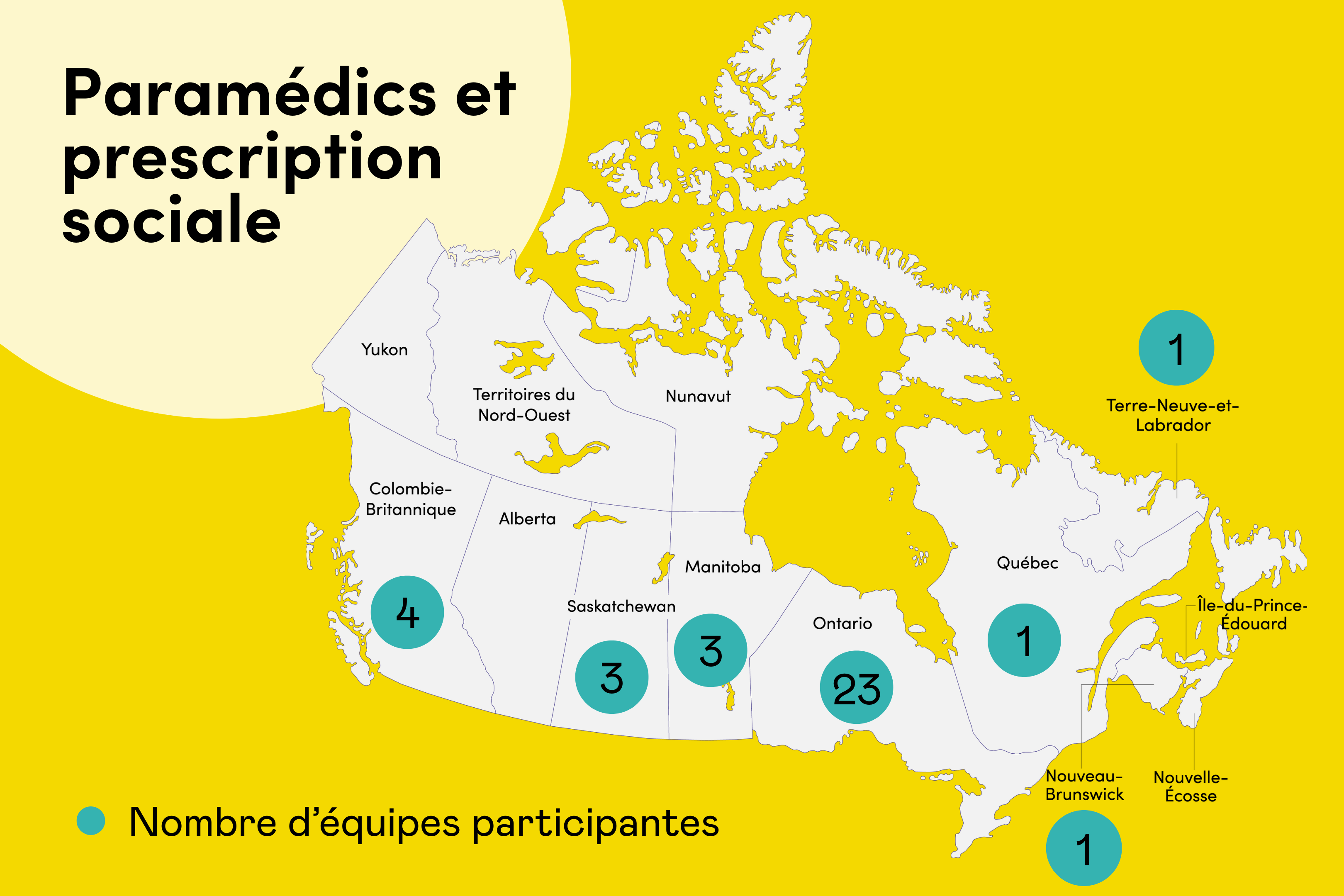 Texte de remplacement : Carte du Canada situant à l'aide de cercles verts les équipes invitées à rejoindre Paramédics et prescription sociale. Texte : Les équipes Paramédics et prescription sociale. Nombre d'équipes participantes.
